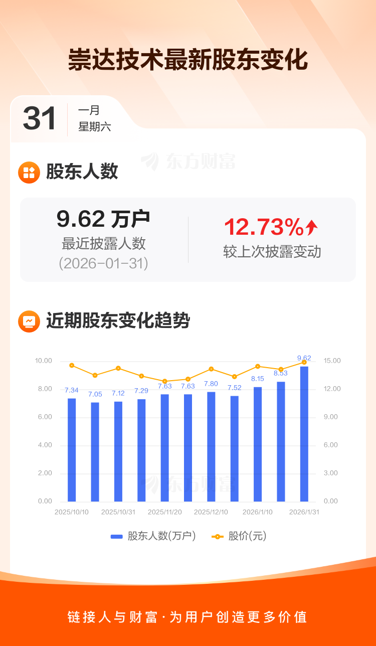 崇达技术最新披露数据显示,截至1月31日公司股东户数为9.62万户,较上期(2026年1月20日)增加1.09万户,增幅为12.73%。户均持有流通股数量由上期的9109股下降至8081股,户均持股金额由上期的12.85万元减少至12.02万元。