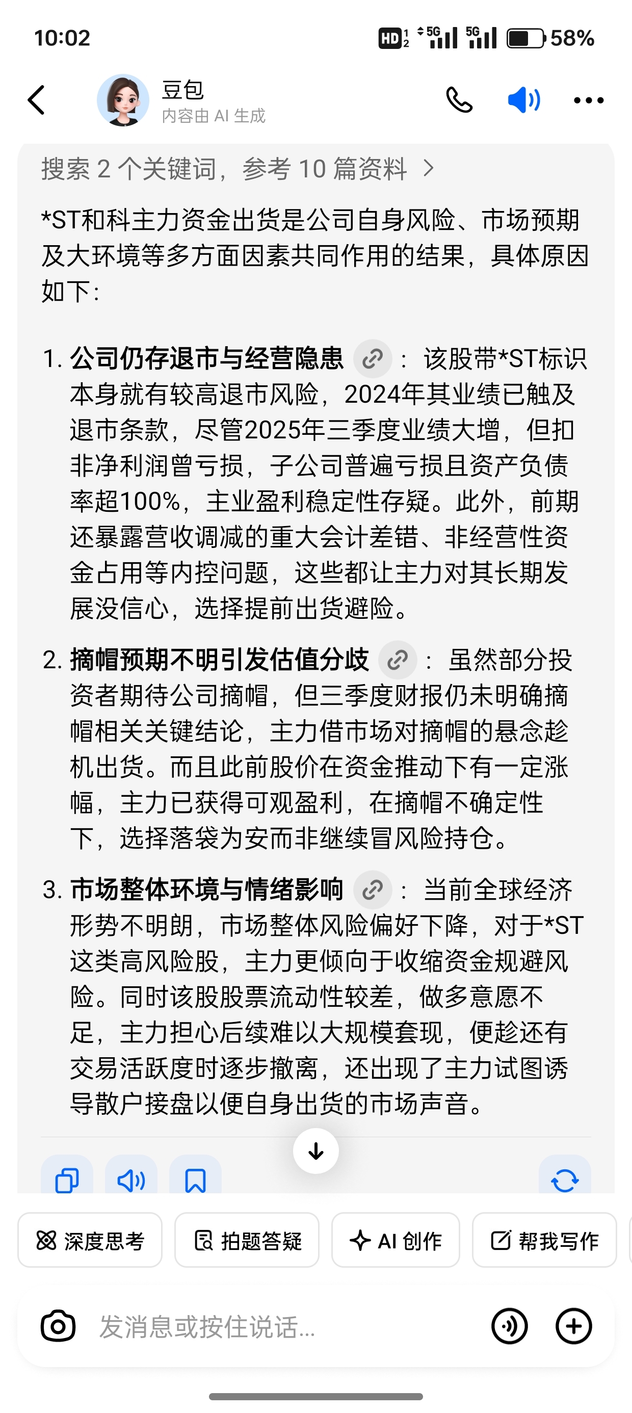 $*ST和科(SZ002816)$ 豆包给出的答案,主力资金确实开始出货了