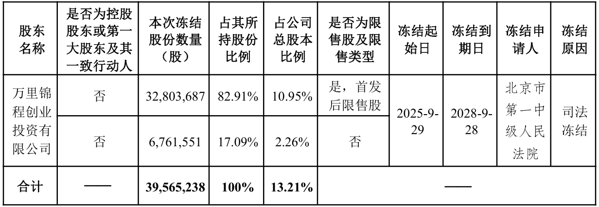 公告显示,此次司法冻结由北京市第一中级人民法院执行,冻结期限自2025年9月29日起至2028年9月28日止,覆盖万里锦程所持东方中科的全部股份3956.52万股,占东方中科总股本的13.21%。其中,3280.37万股为“首发后限售股”,占万里锦程所持股份比例的82.91%。