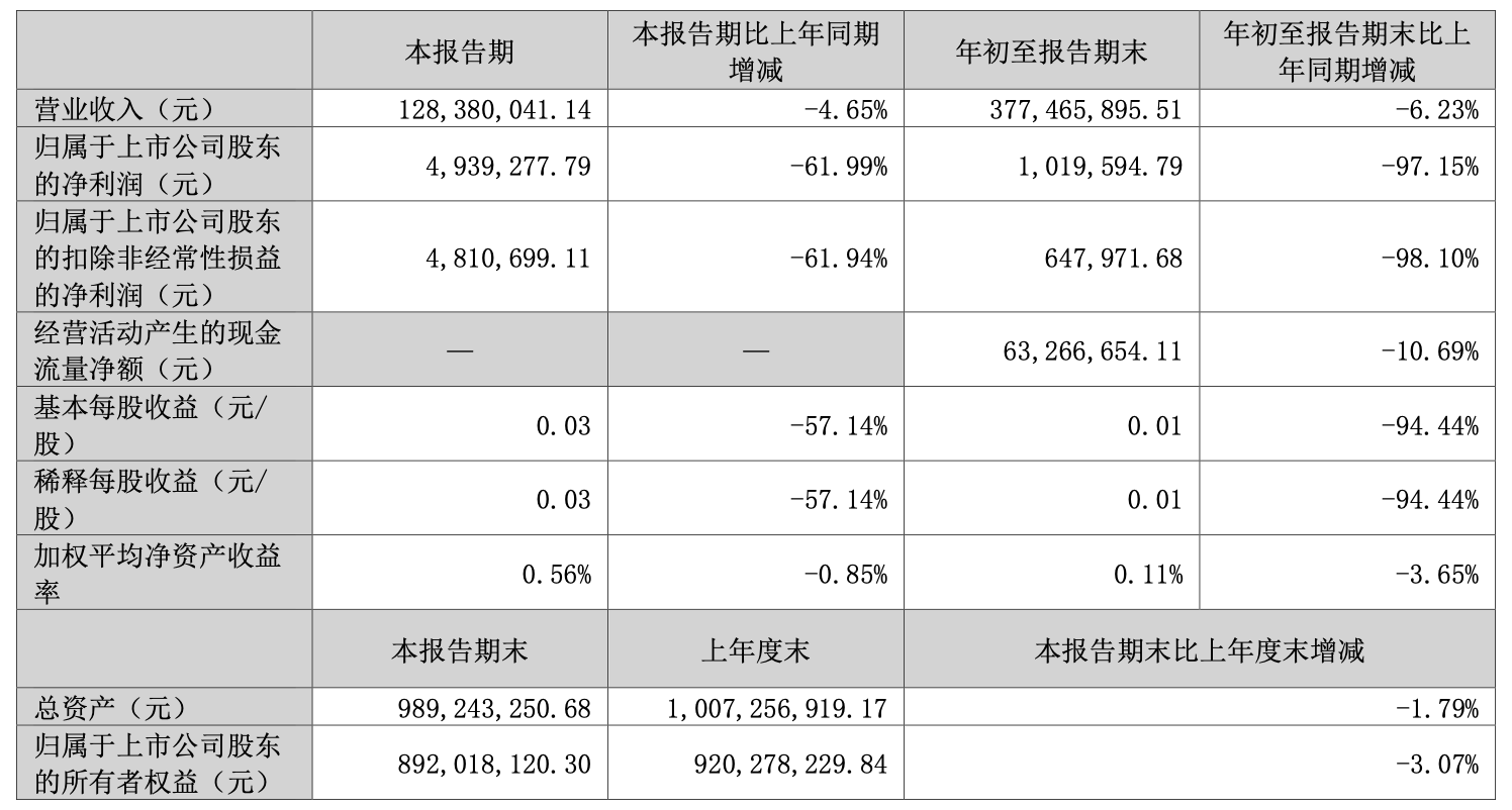 其中,第三季度营收为1.28亿元,下降4.65%;净利润为493.93万元,下降61.99%。