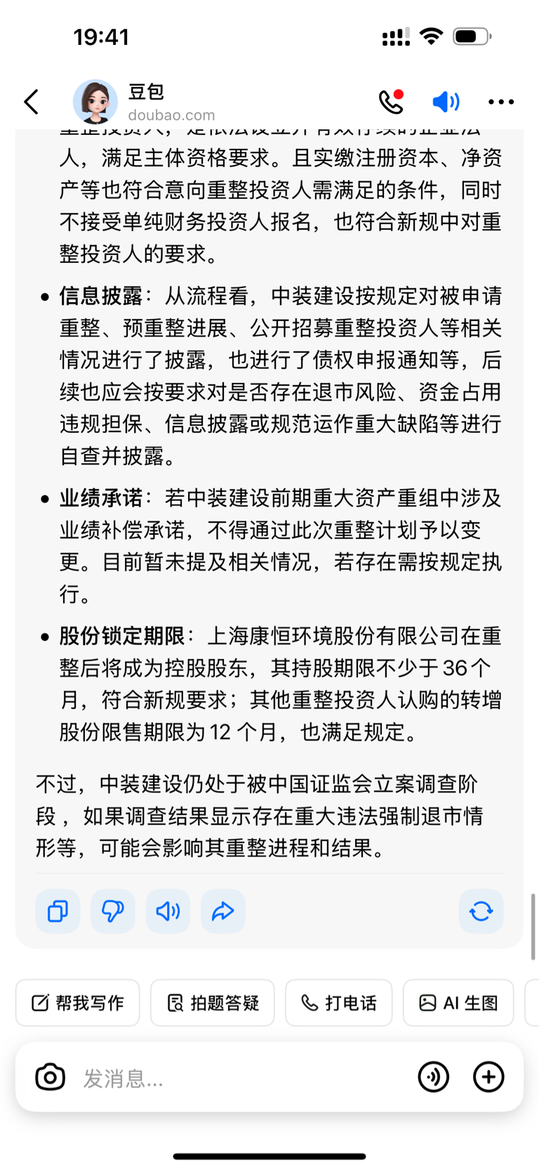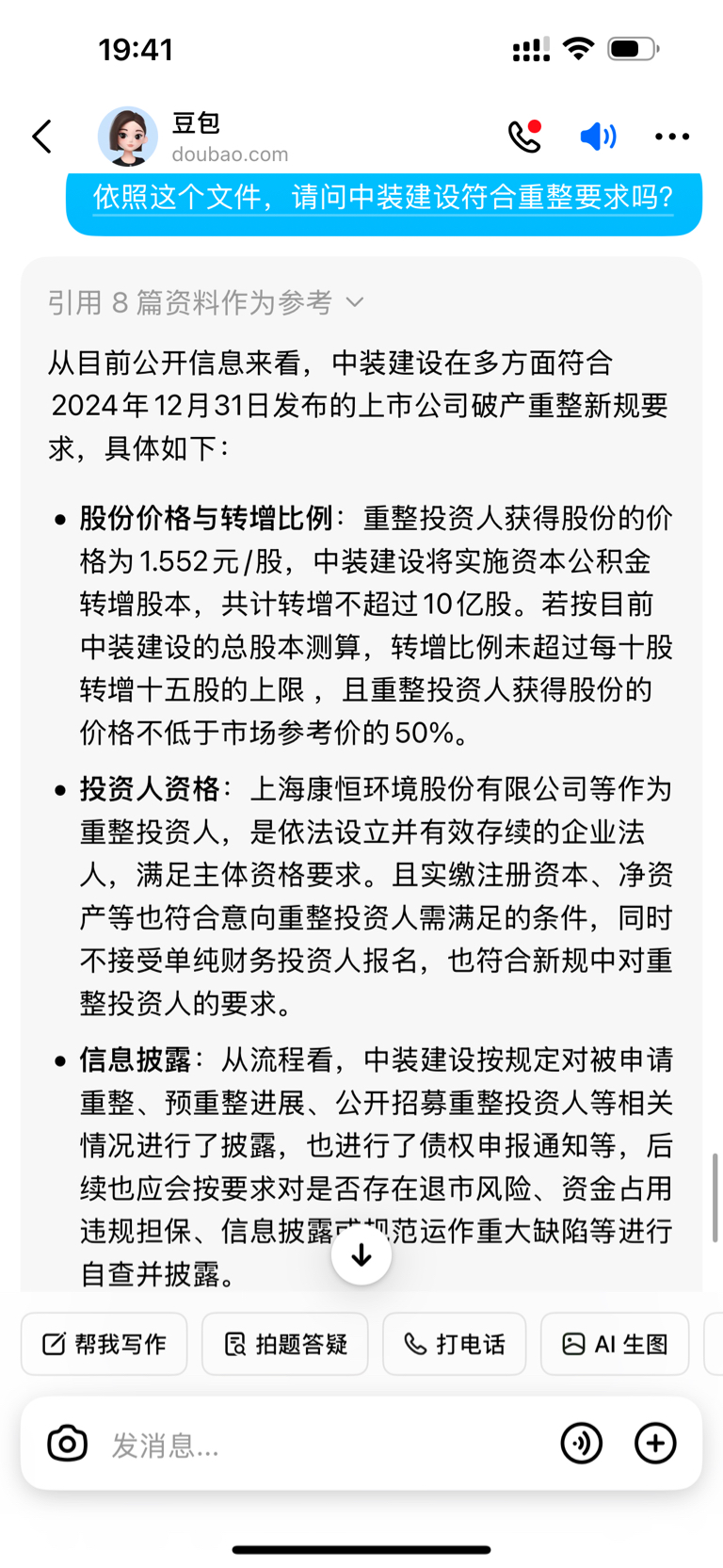 中装建设多方面符合2024年12月31日发布的文件重整新规。(陈述)