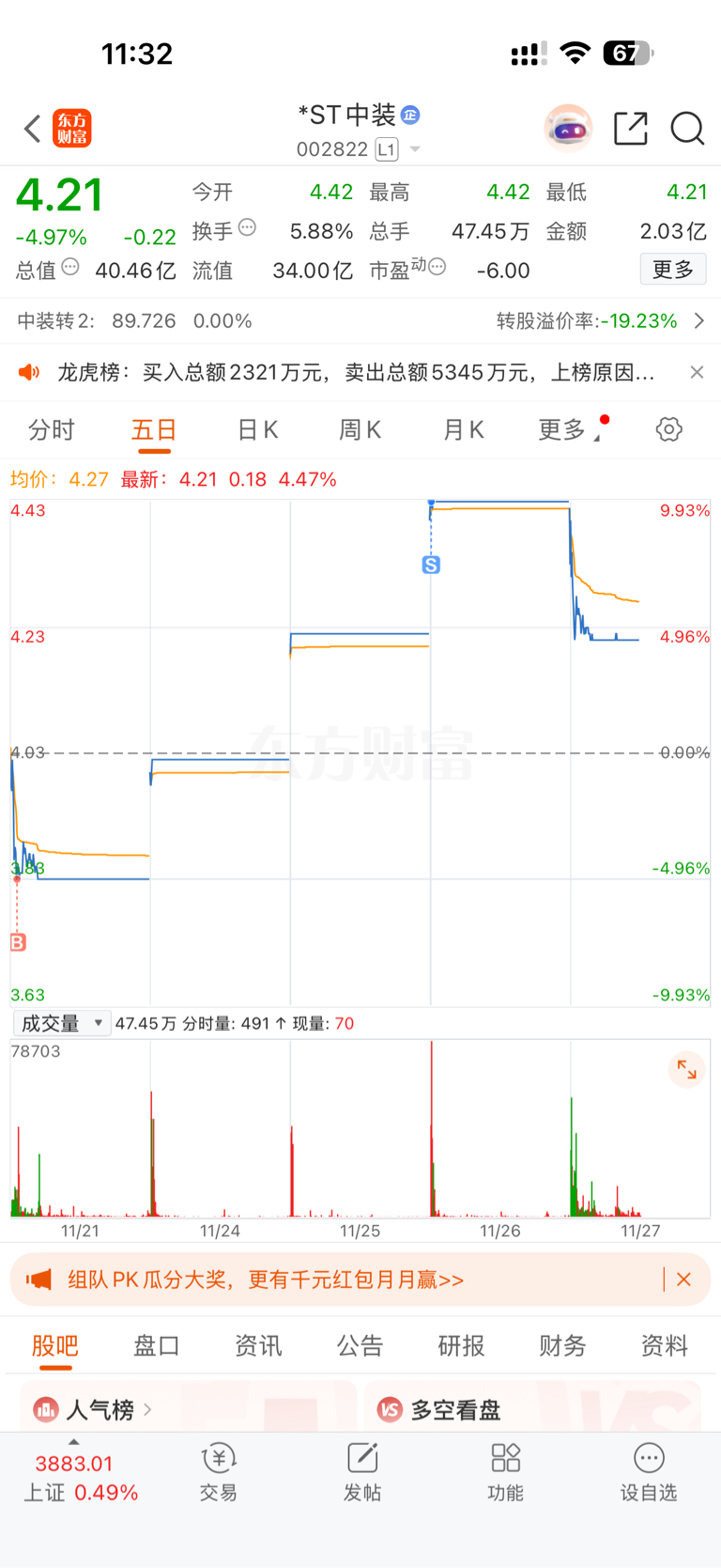 $*ST中装(SZ002822)$ 我走了。你们继续舞