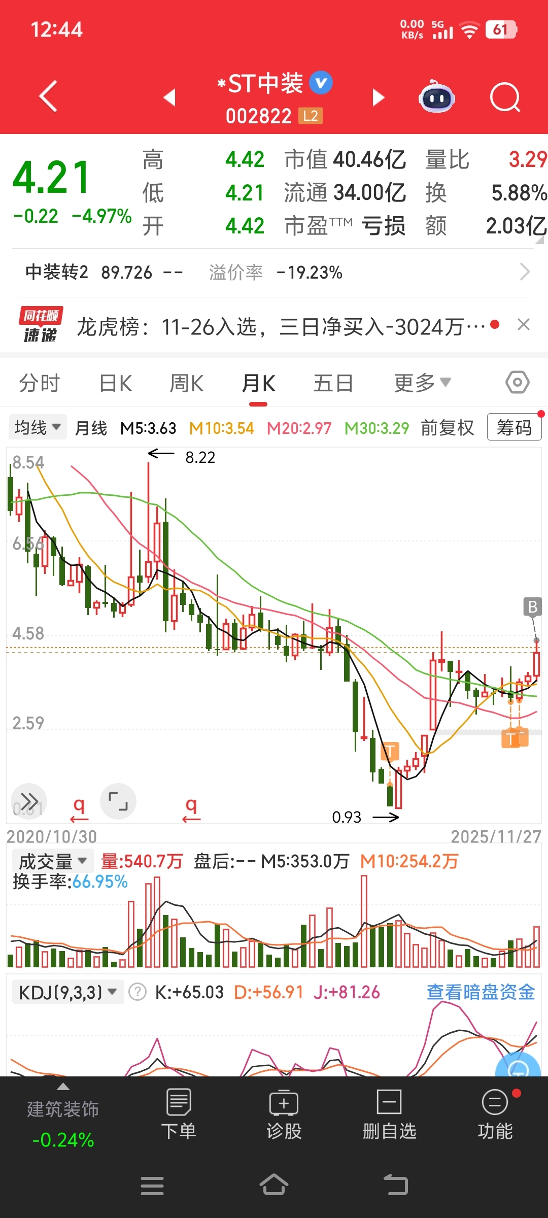 $*ST中装(SZ002822)$ 最低点买过,也在最高点买过。跌停加仓,这次必须赚钱在走