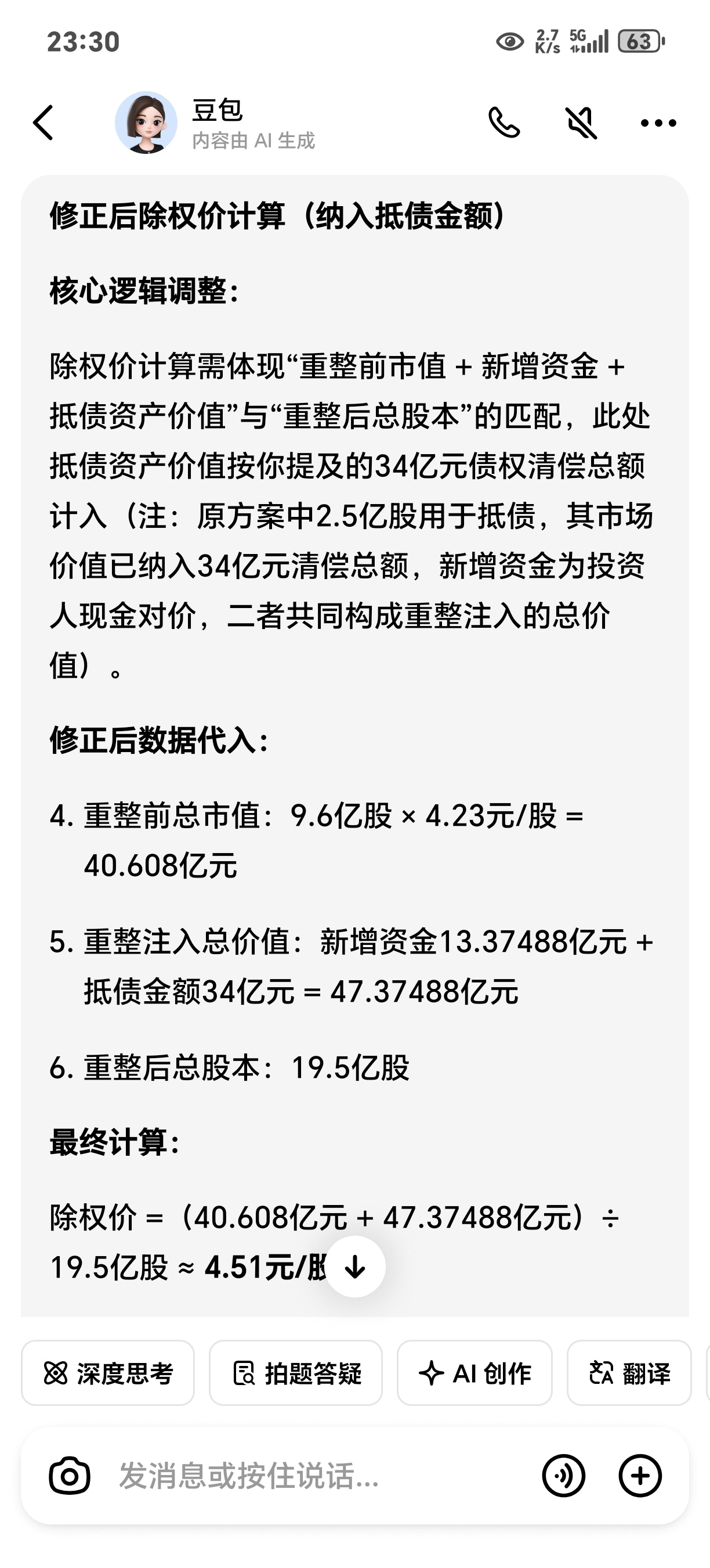 这是我用豆包计算的重整后除权价,比现价还要高,虽然原始数据不是很精准,但大概不差
