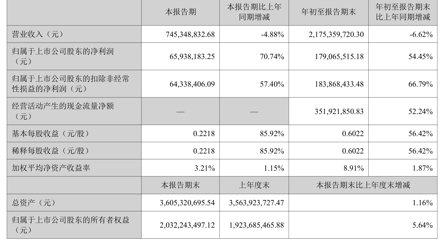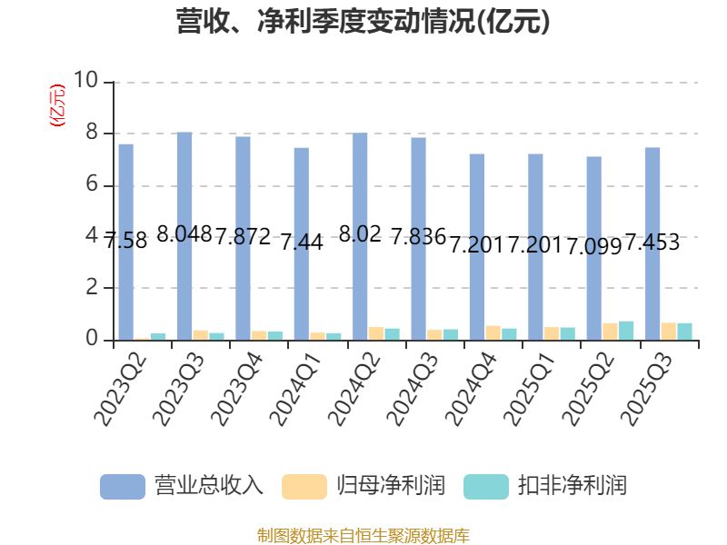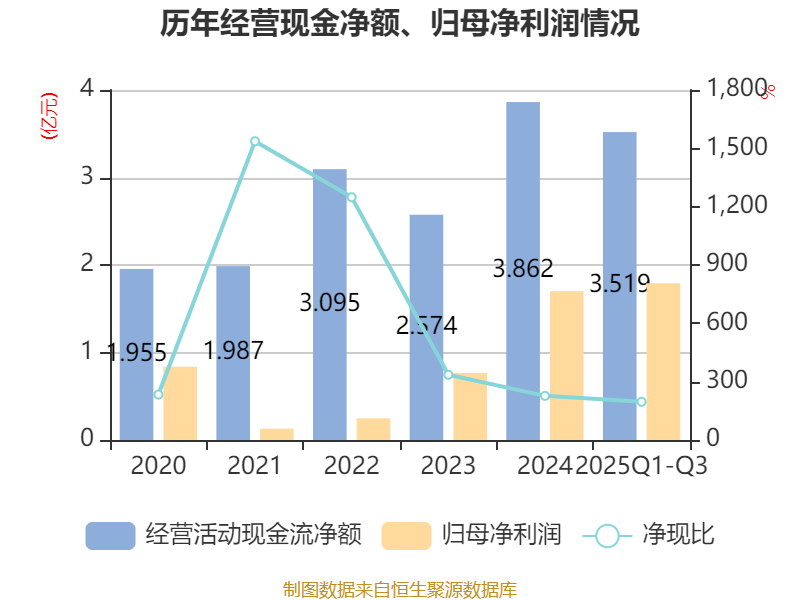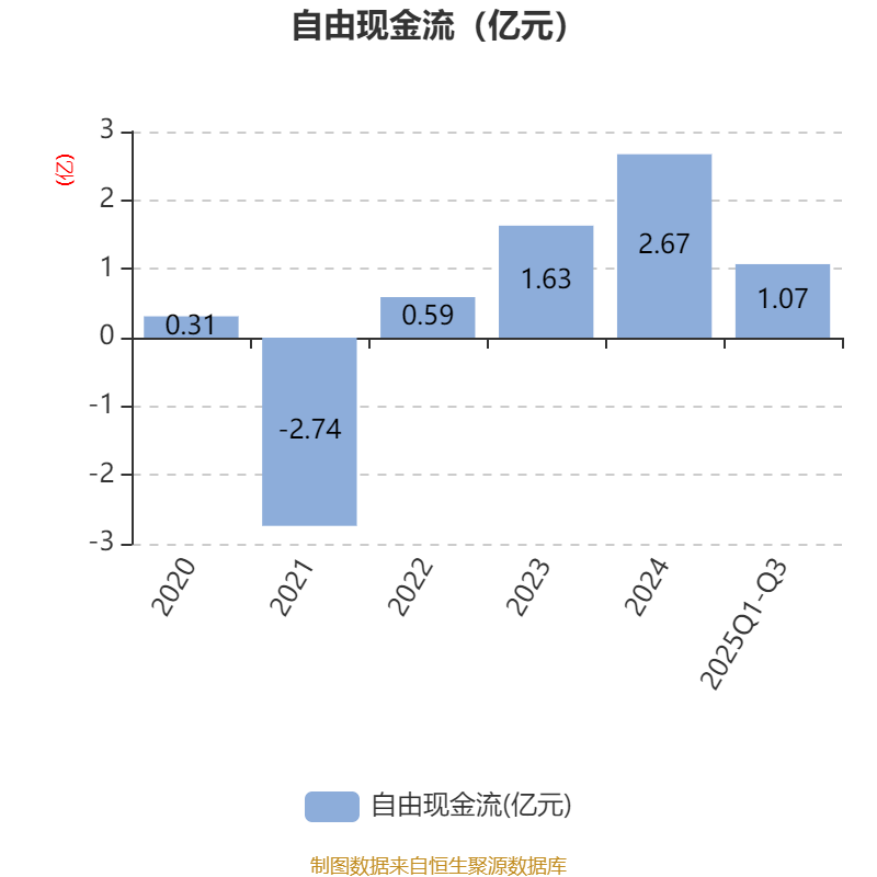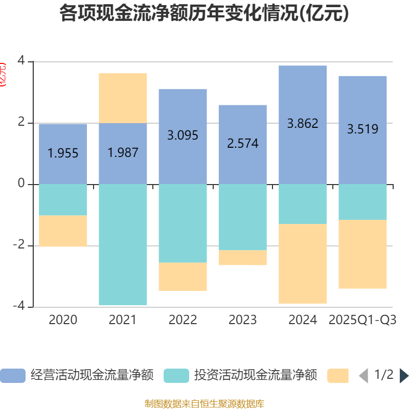 2025年前三季度,公司经营活动现金流净额为3.52亿元,同比增长52.24%;筹资活动现金流净额-2.24亿元,同比减少1.12亿元;投资活动现金流净额-1.17亿元,上年同期为-1.52亿元。