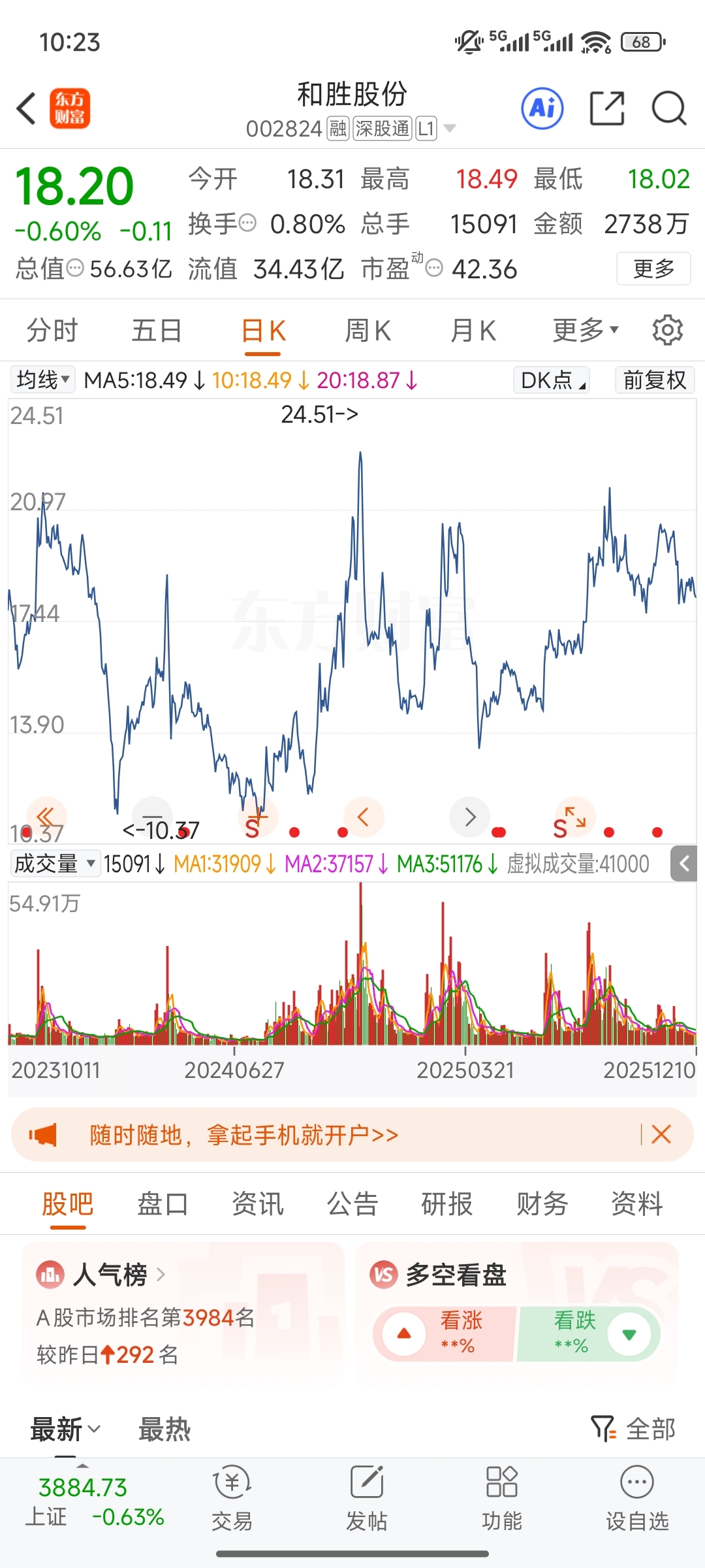 $和胜股份(SZ002824)$ 这走势看来,又要下降了。。