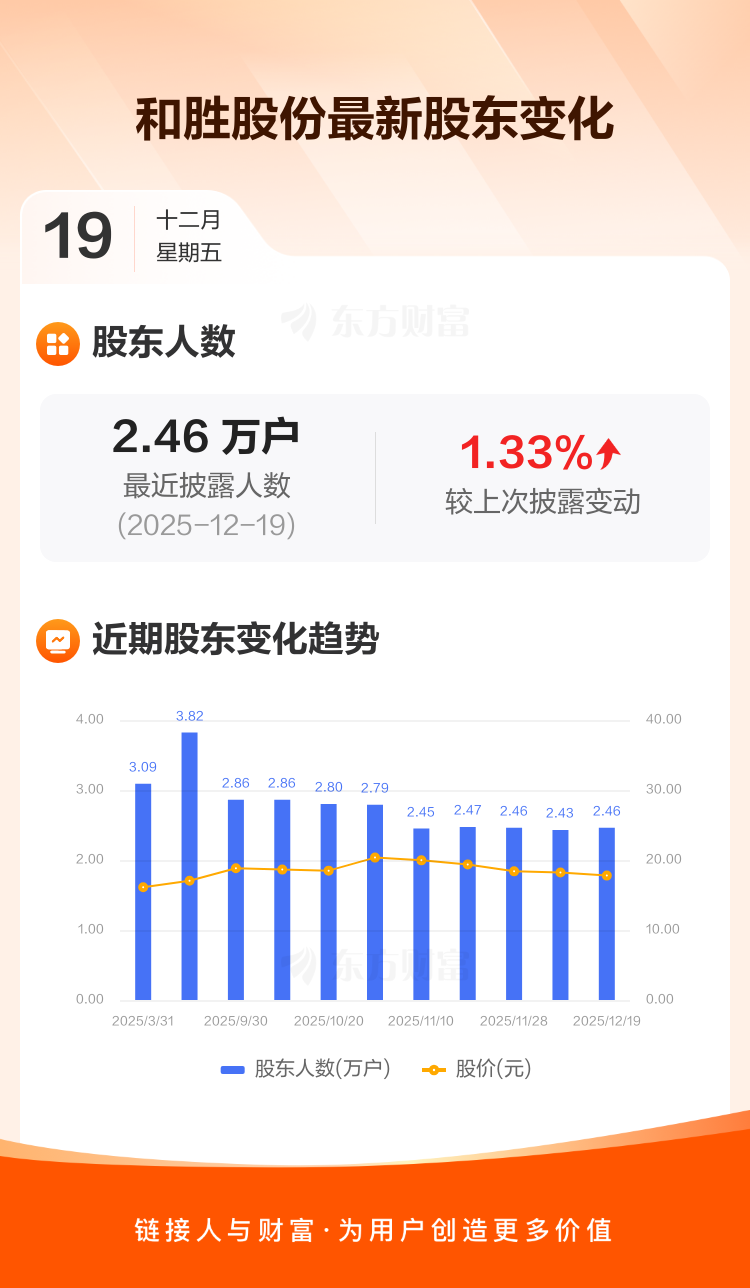和胜股份最新披露数据显示,截至12月19日公司股东户数为2.46万户,较上期(2025年12月10日)增加324户,增幅为1.33%。户均持有流通股数量由上期的7792股下降至7689股,户均持股金额由上期的14.19万元减少至13.66万元。
