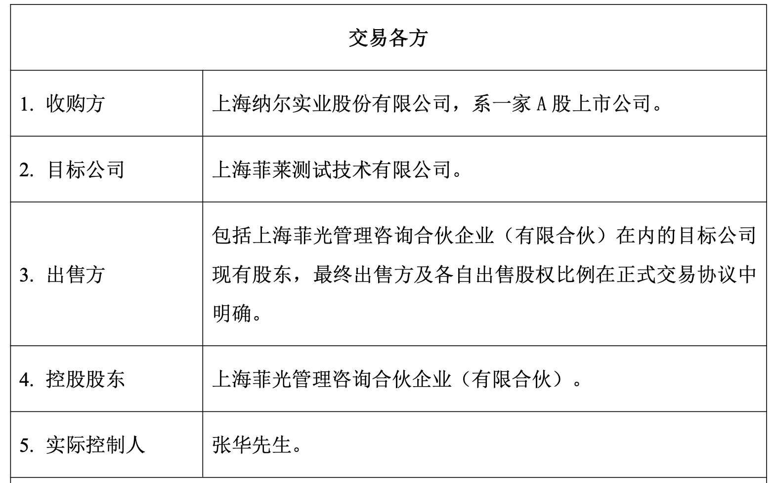10月15日,纳尔股份(002825)公告,公司与上海菲光管理咨询合伙企业(有限合伙)、张华签订了《股权收购意向协议》,公司以受让出售方所持上海菲莱测试技术有限公司(简称“菲莱测试”)股权的方式投资菲莱测试。