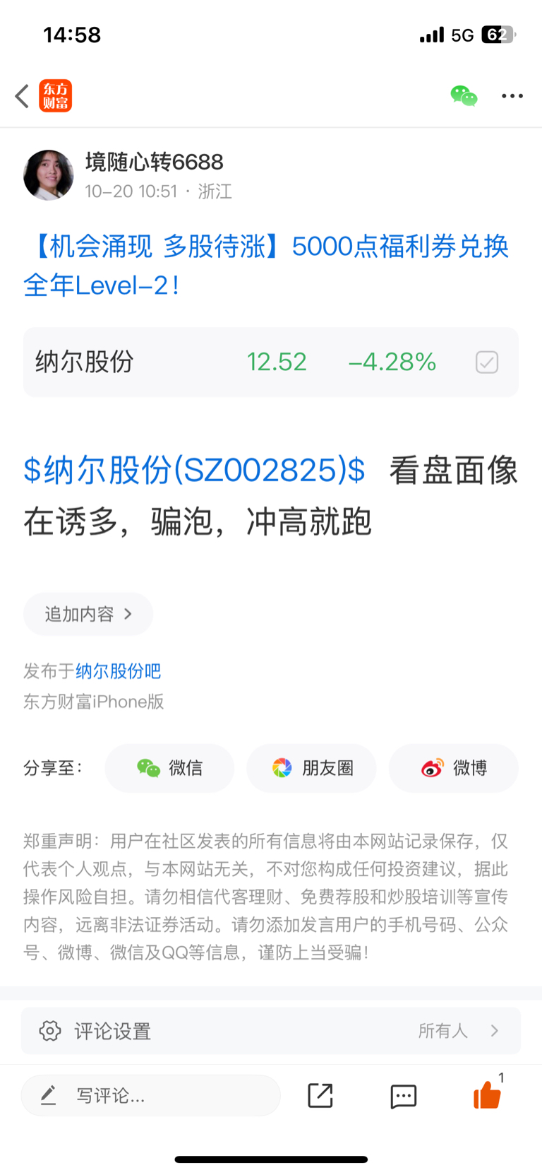 温馨提示: 1.根据《证券法》规定,禁止编造、传播虚假信息或者误导性信息,扰乱证券市场;2.用户在本社区发表的所有资料、言论等仅代表个人观点,与本网站立场无关,不对您构成任何投资建议。用户应基于自己的独立判断,自行决定证券投资并承担相应风险。《东方财富社区管理规定》