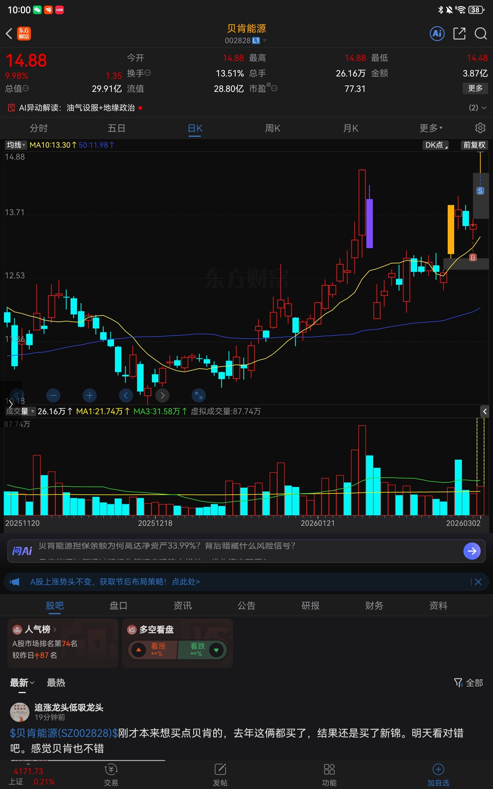 温馨提示: 1.根据《证券法》规定,禁止编造、传播虚假信息或者误导性信息,扰乱证券市场;2.用户在本社区发表的所有资料、言论等仅代表个人观点,与本网站立场无关,不对您构成任何投资建议。用户应基于自己的独立判断,自行决定证券投资并承担相应风险。《东方财富社区管理规定》
