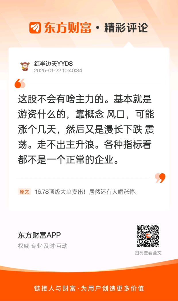 我哭了//@红半边天YYDS :这股不会有啥主力的。基本就是游资什么的,靠概念 风口,可能涨个几天,然后又是漫长下跌 震荡。走不出主升浪。各种指标看都不是一个正常的企业。