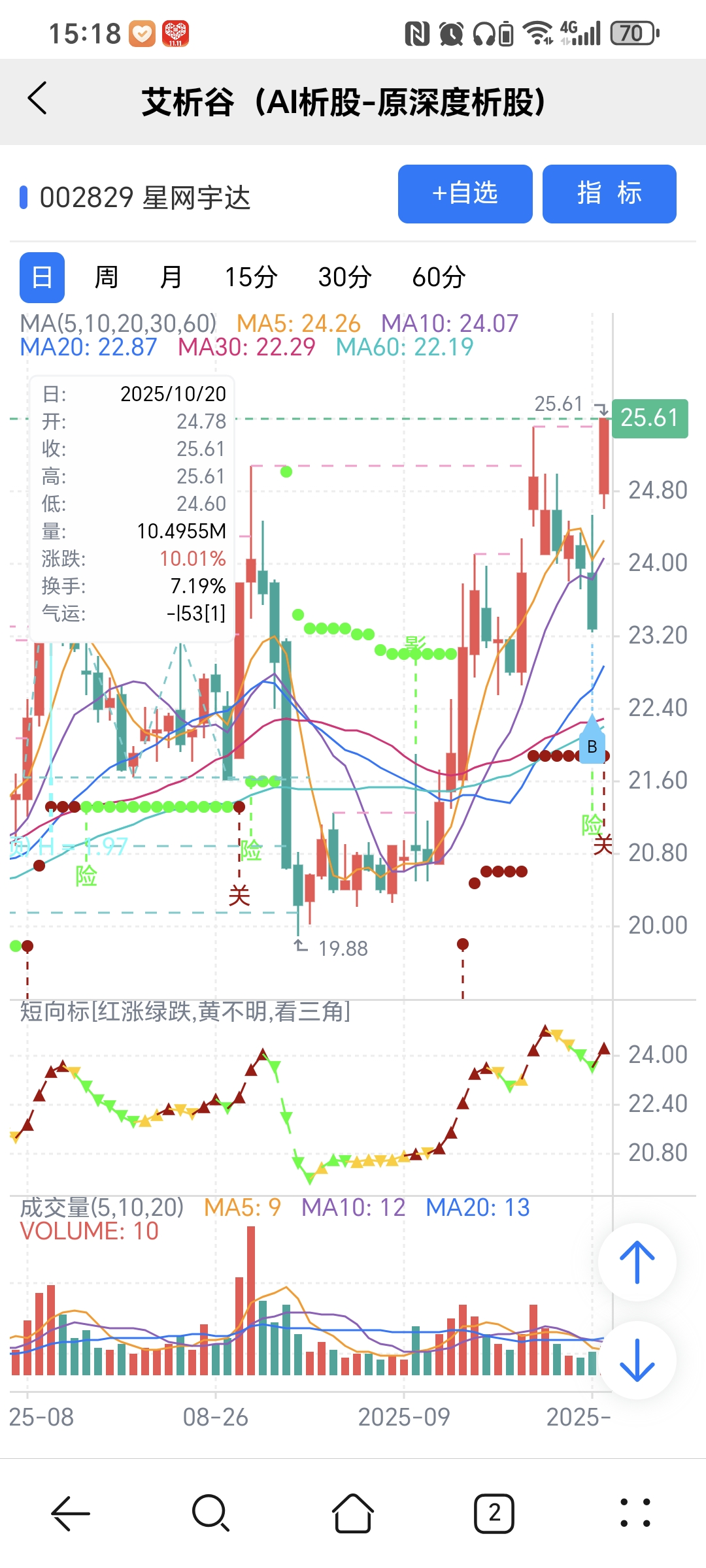 红绿小圆点是艾析谷的量化指标-超级短趋线,是趋势跟踪+突破类的量化指标,完全免费。