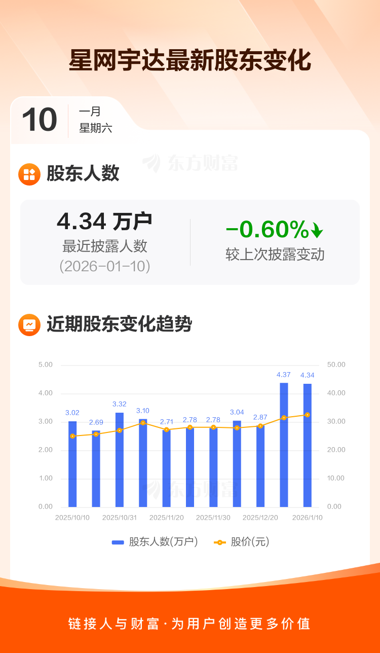 星网宇达最新披露数据显示,截至1月10日公司股东户数为4.34万户,较上期(2025年12月31日)减少261户,降幅为0.60%。户均持有流通股数量由上期的3344股上升至3365股,户均持股金额由上期的10.51万元增加至10.92万元。