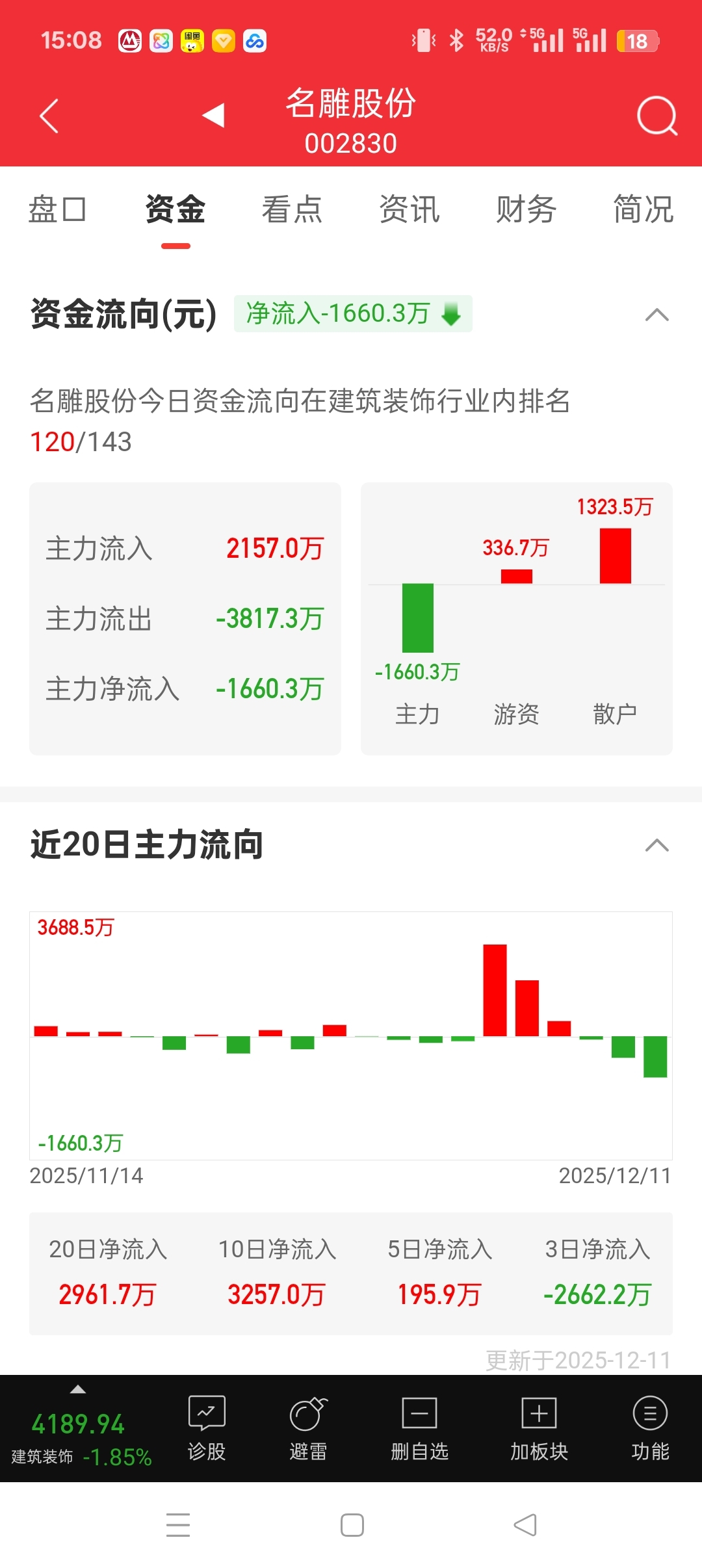 $名雕股份(SZ002830)$ 主力已出货离场!跟投顾圈进的票,高位时候不让卖,已套!