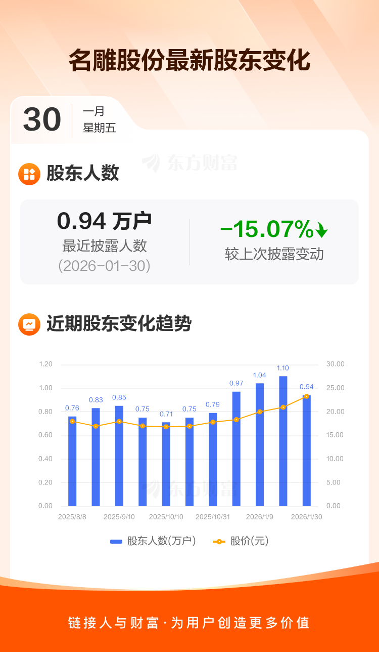 名雕股份最新披露数据显示,截至1月30日公司股东户数为9358户,较上期(2026年1月20日)减少1661户,降幅为15.07%。户均持有流通股数量由上期的6067股上升至7143股,户均持股金额由上期的12.70万元增加至16.61万元。