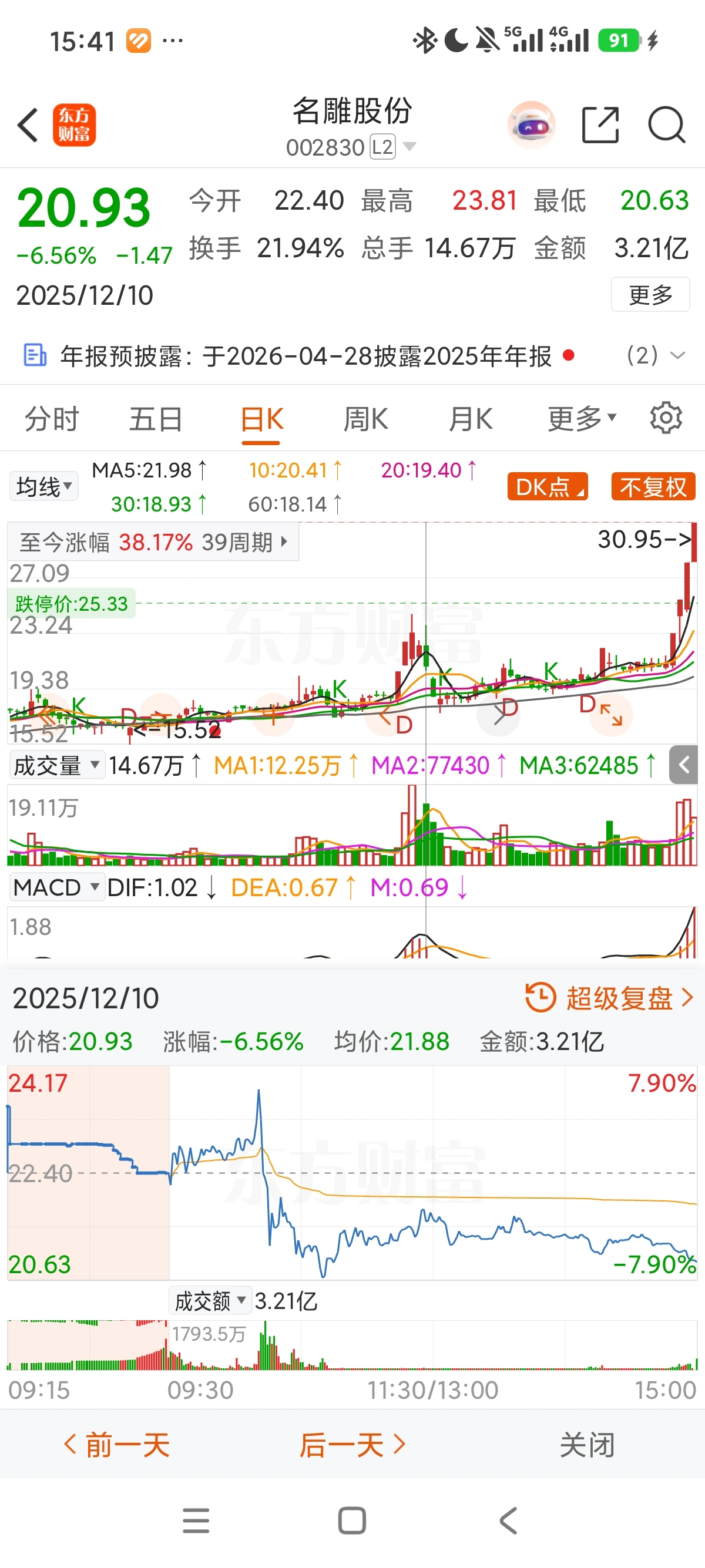 $名雕股份(SZ002830)$ 去年亏损最大的一只股,一天损失十几个点。当时被炒股养几毛砸的