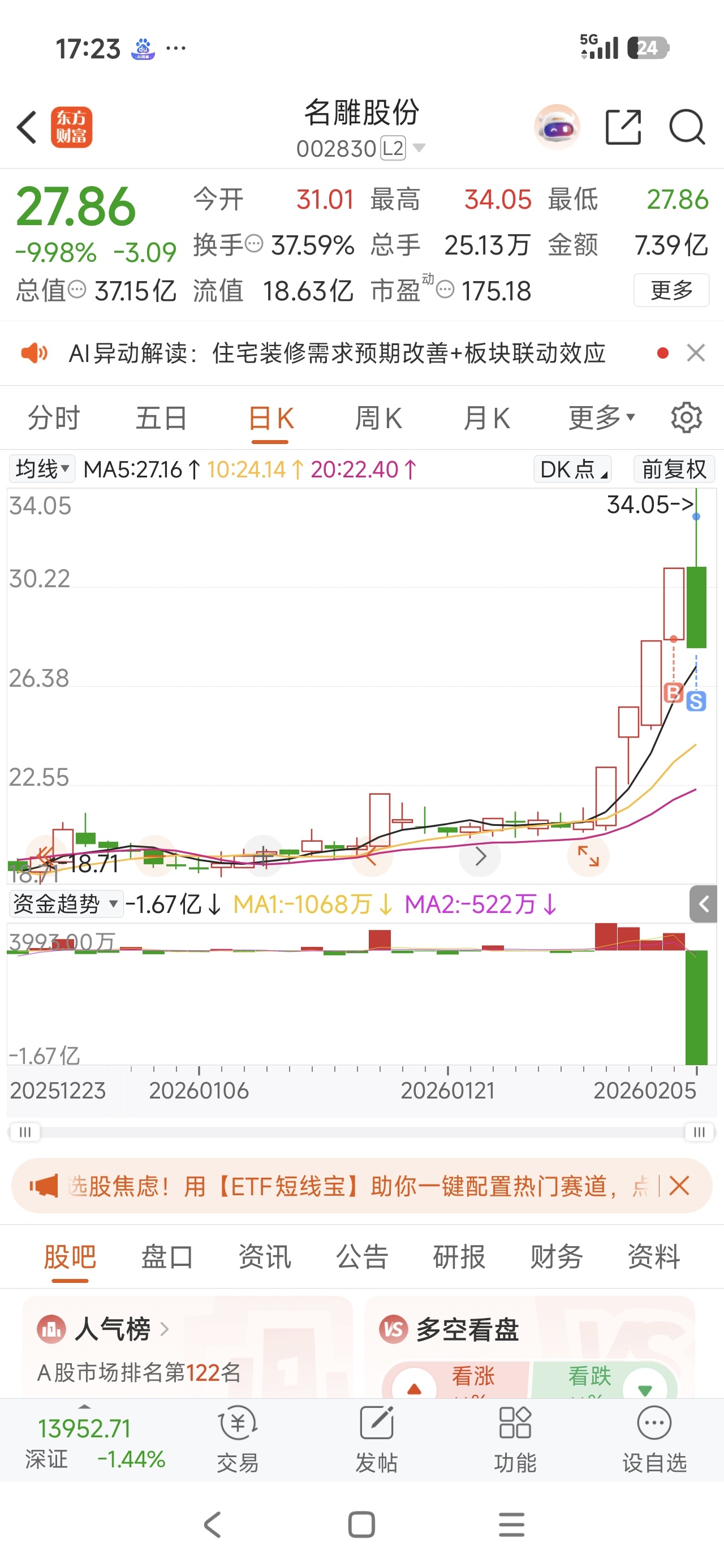 $名雕股份(SZ002830)$ 各位散户,作为在股市六年的老手,这个绝对不是顶!我感觉是龙头首阴,肯定还有二波,明天肯定得反弹
