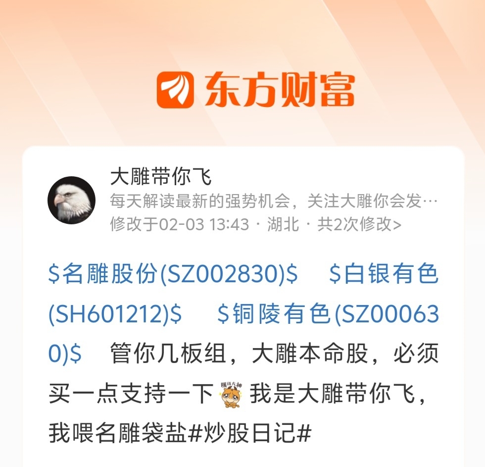 $名雕股份(SZ002830)$ 名雕股份是正宗的大雕带你飞概念股。明天高开涨停,后面高开涨停,大后天高开涨停……#收盘点评# #实盘记录# #晒单全纪实#
