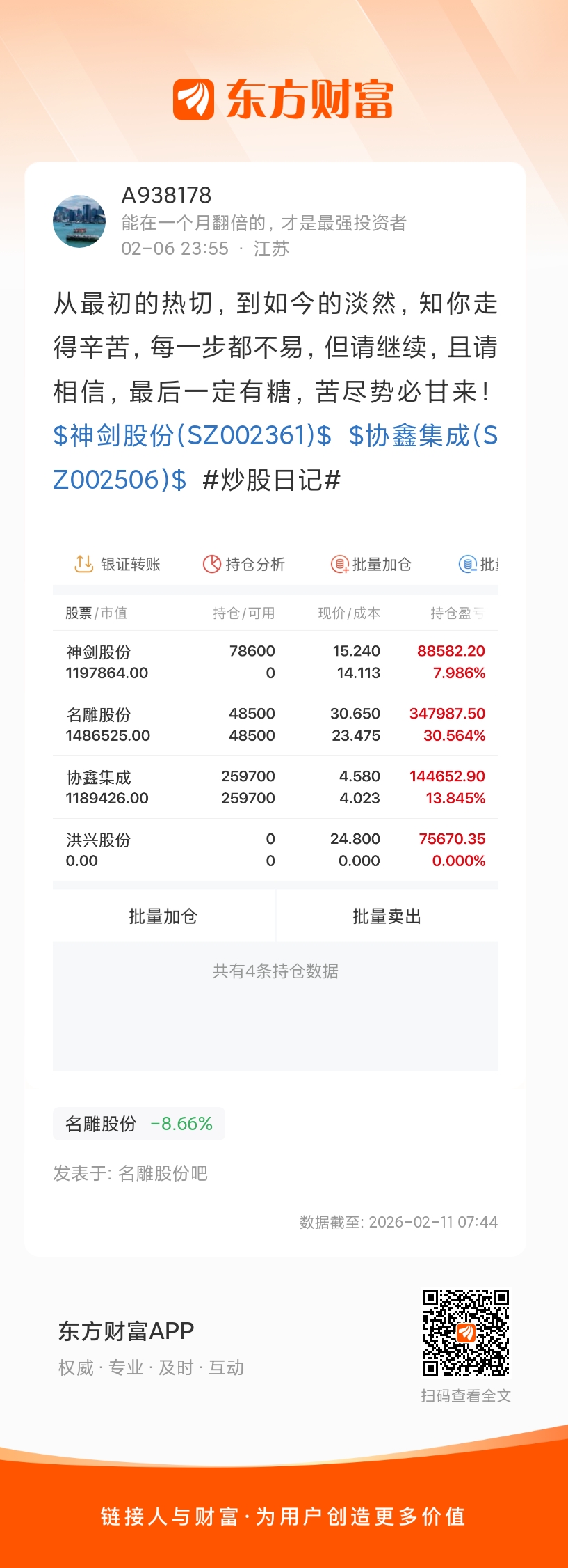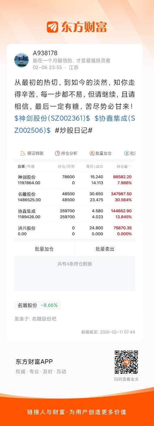 从最初的热切,到如今的淡然,知你走得辛苦,每一步都不易,但请继续,且请相信,最后一定有糖,苦尽势必甘来!$神剑股份(SZ002361)$ $协鑫集成(SZ002506)$ #炒股日记#
