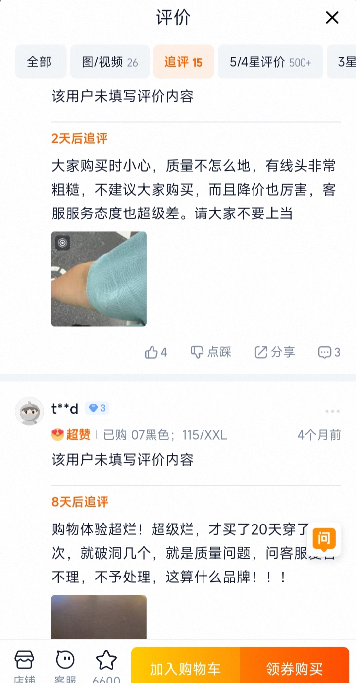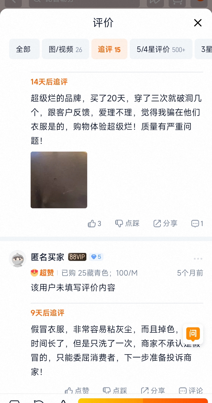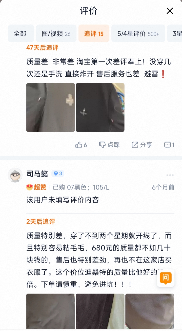 $比音勒芬(SZ002832)$ 天猫旗舰店销量最高的一款,一共15个追评,14个追评是差评