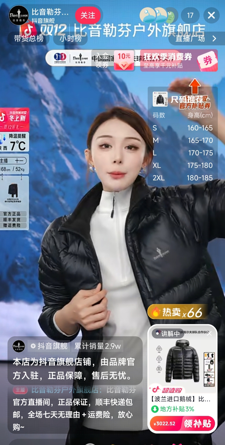 比音的抖音直播间,关注了几个月了。最近冬装羽绒服和外套都卖的不错。从今年开始,四