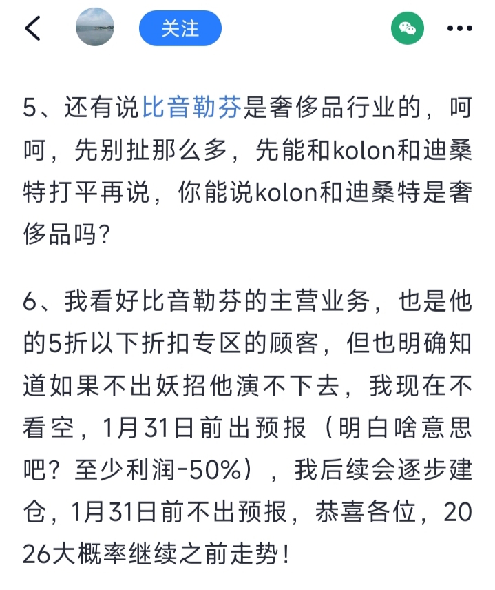 $比音勒芬(SZ002832)$ 雪球上一个大师说,因为换标,库存跌价,加上收购两个品牌,加上卖不动各种buff叠加。得出结论,1.30前要出业绩下降50%预告。大师说的对吗?