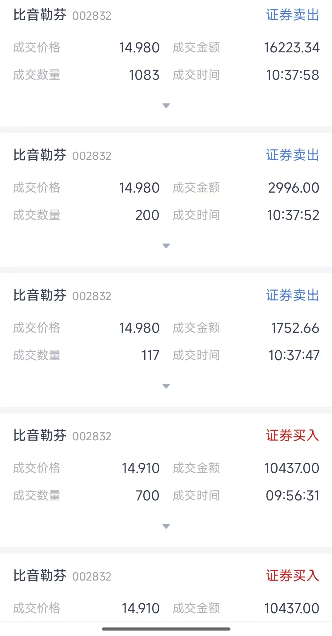 $比音勒芬(SZ002832)$ 14.91的,14.98已经全出了。这个点位,本来打算再多买点,结果这坨的融资额我的券商才给3700股。这还多买个蛋。接着做T了。