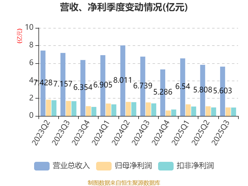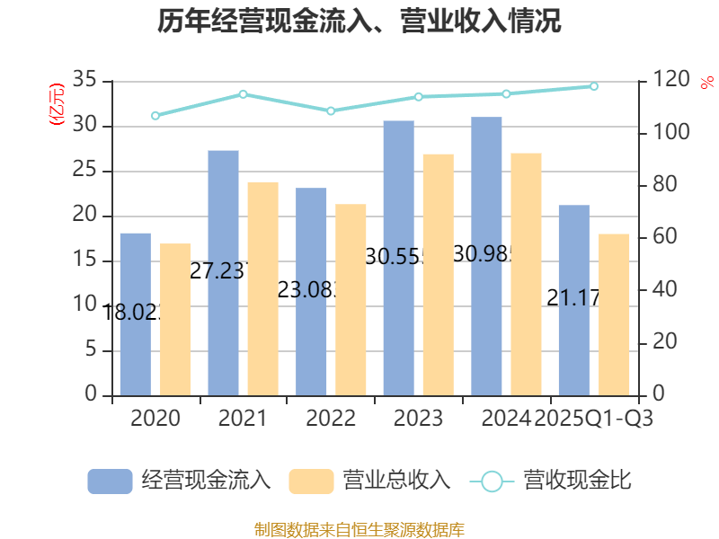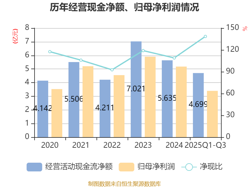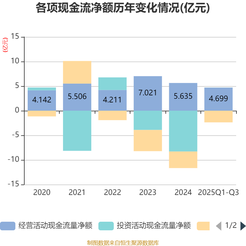2025年前三季度,公司经营活动现金流净额为4.7亿元,同比增长5.68%;筹资活动现金流净额-2.37亿元,同比增加4388.68万元;投资活动现金流净额114.1万元,上年同期为-10.3亿元。