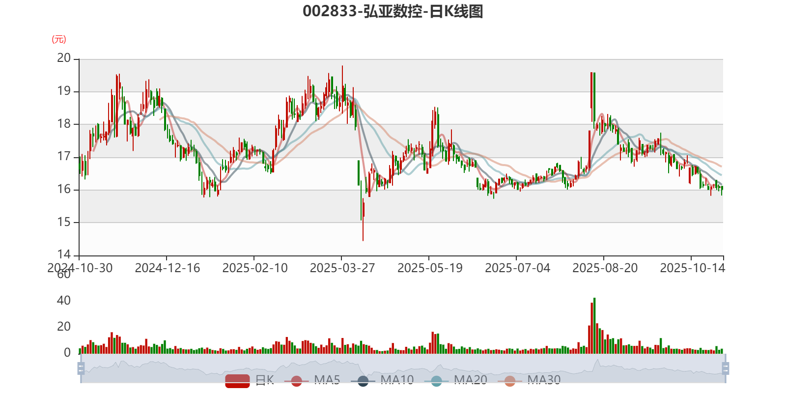中证智能财讯弘亚数控(002833)10月30日披露2025年第三季度报告。前三季度公司实现营业总收入17.95亿元,同比下降17.10%;归母净利润3.39亿元,同比下降25.48%;扣非净利润3亿元,同比下降30.48%;经营活动产生的现金流量净额为4.7亿元,同比增长5.68%;报告期内,弘亚数控基本每股收益为0.8元,加权平均净资产收益率为11.52%。