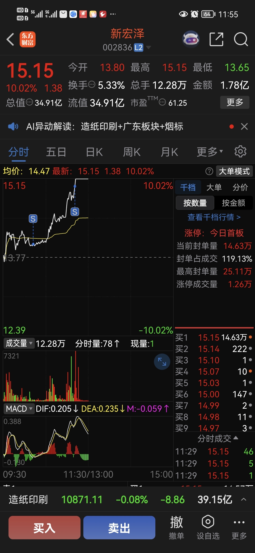 $新宏泽(SZ002836)$ 清仓走人,一板结束