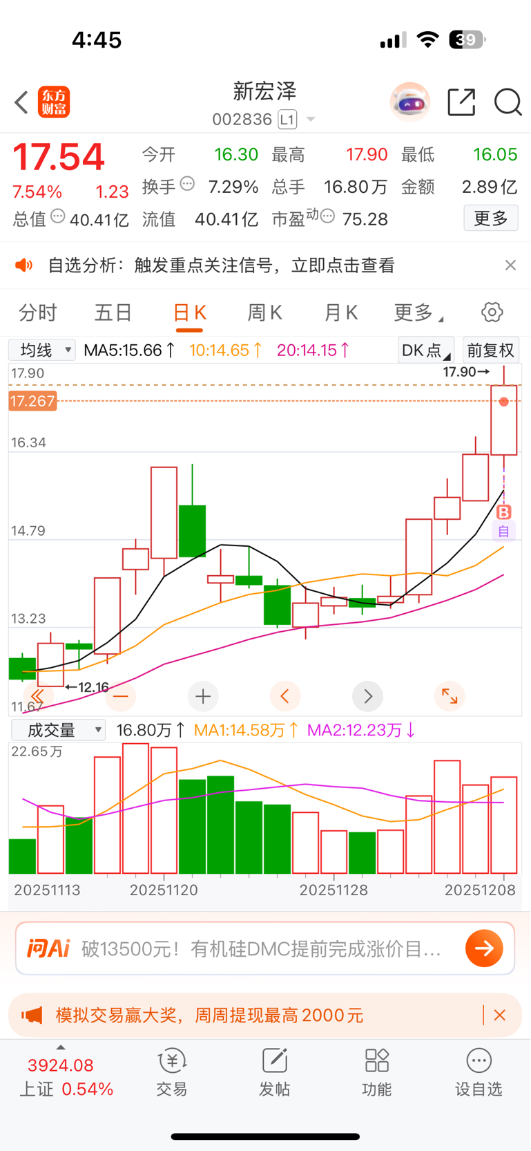 $新宏泽(SZ002836)$ 今天卖了佛塑科技买了他,要是明天能带点量高开的话,主升浪的趋势就彻底打开了,涨停以后三连阳称之为喜鹊闹梅,次日高开上升不言顶,加油