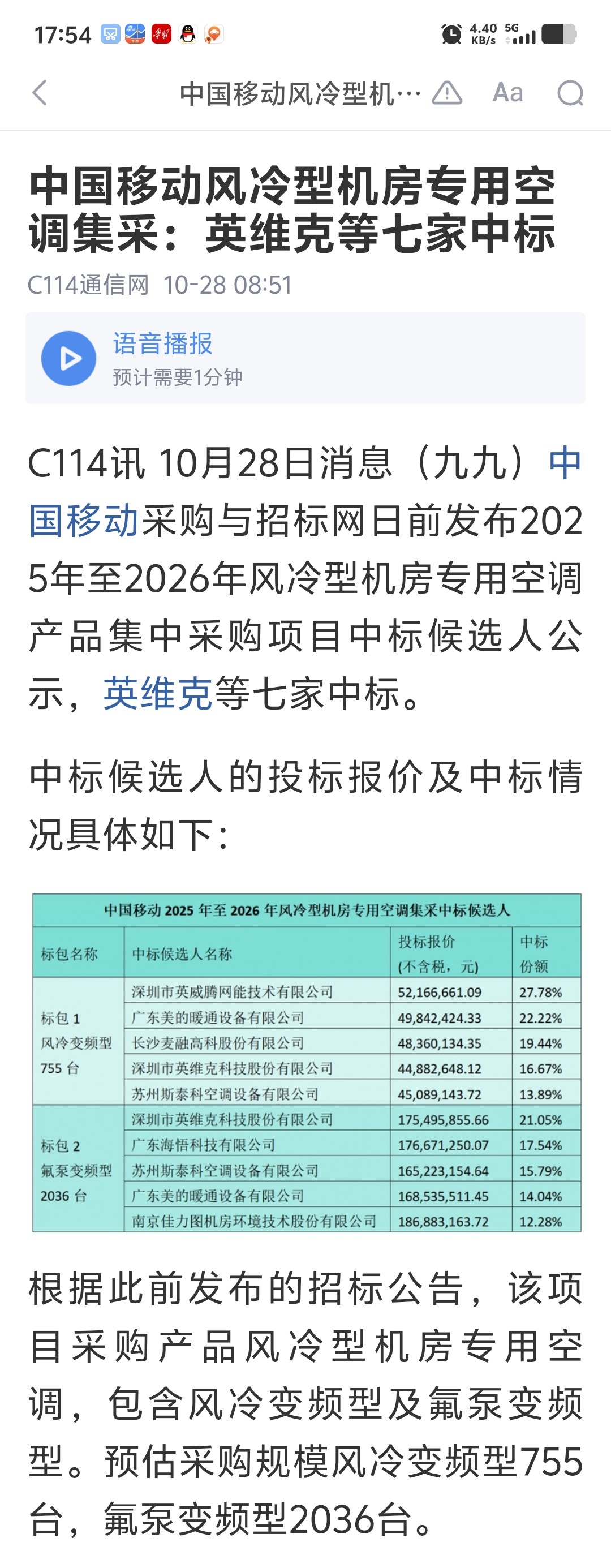 $英维克(SZ002837)$ 中国移动风冷型机房专用空调集采:英维克等七家中标