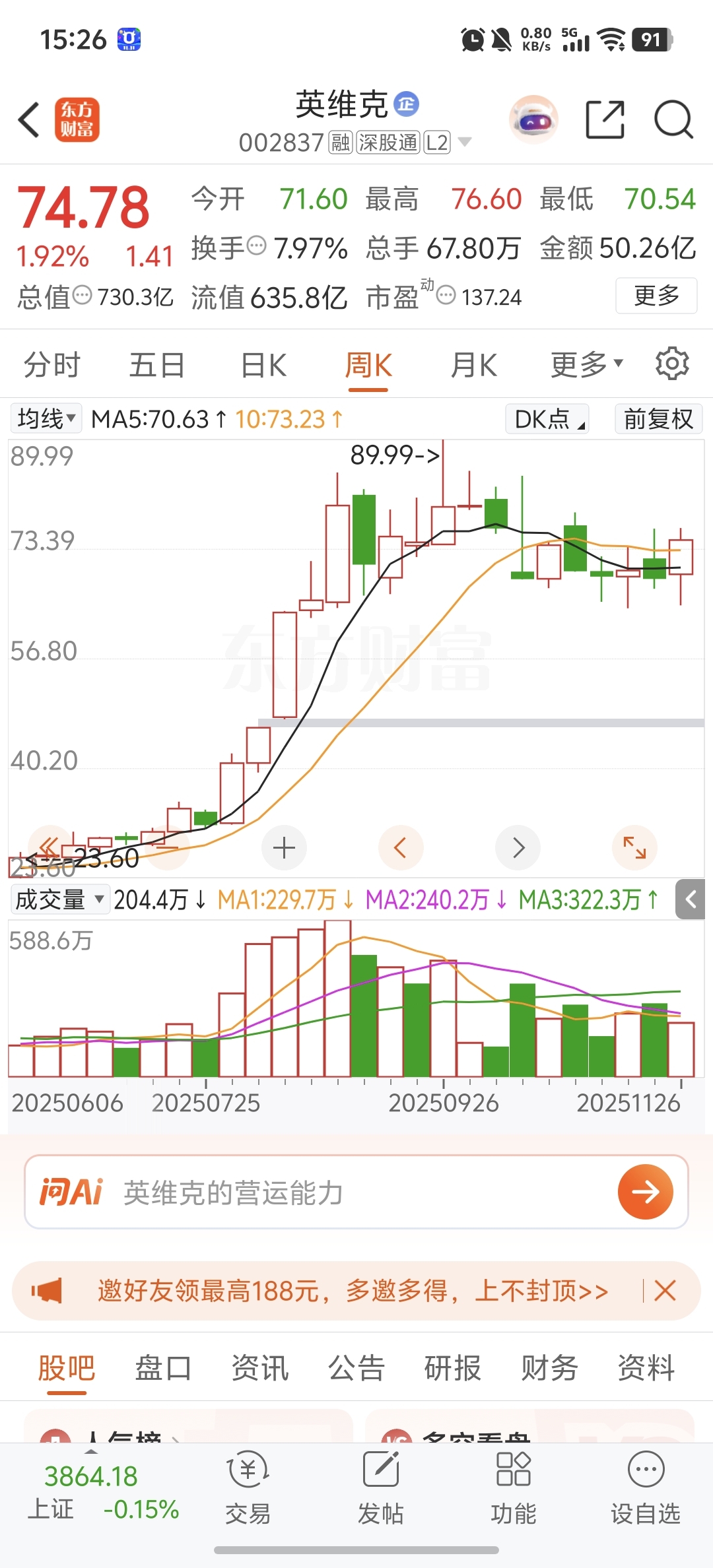 $英维克(SZ002837)$ 我发现了评论区拿长线的都是乐观的,打开周线,英子这种调整其实还真不用担心