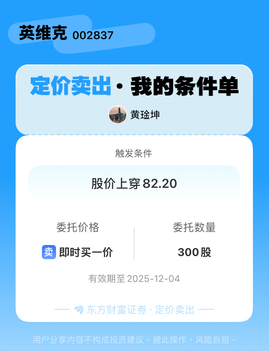 #条件单交流# #定价卖出晒单# 一位股神设置了一个定价卖出条件单,接下来就是见证奇迹的时刻~$英维克(SZ002837)$