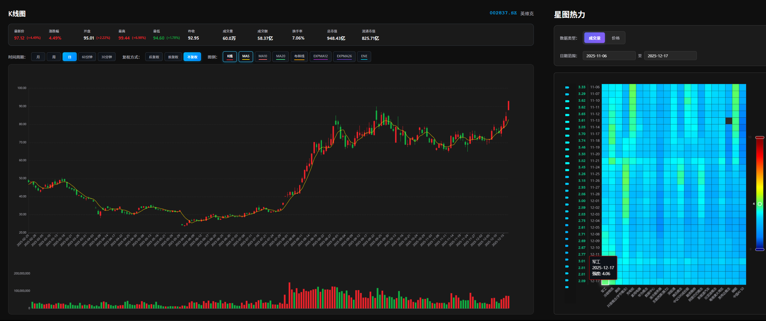 1. 热力图左边数值显示大盘情绪小幅回暖至2.89,大家可以小仓位进场。2.第二张英维克板块热力图颜色变暖,热度上升,注意仓位小幅进场。3.最后也可以参考一下今日六脉神剑判断。