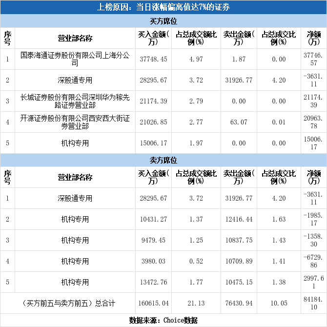 龙虎榜数据显示,今日共5个机构席位出现在龙虎榜单上,分别位列买五、卖二、卖三、卖四、卖五,合计净买入7930.47万元,占龙虎榜净买额的9.42%。除此之外还有神农种业、多氟多、海南海药等47只个股榜单上出现了机构的身影,其中23家呈现机构净买入,获净买入最多的是神农种业,净买额为4.85亿元;24家呈现机构净卖出,其中遭净卖出最高的为美埃科技,净卖额为1.37亿元。