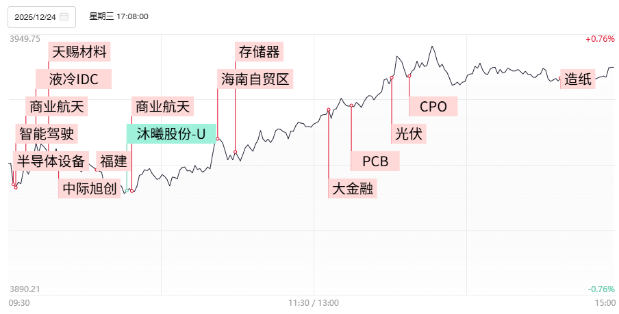 财联社12月25日电,上个交易日市场震荡拉升,沪指高开高走收出六连阳,深成指涨近1%。全市场超4100只个股上涨。沪深两市成交额1.88万亿,较前日缩量196亿。1)12月24日,第三届中国商业航天发展大会在北京召开,商业航天概念结束调整卷土重来,连板高度神剑股份晋级5连板,700亿市值权重股中国卫星实现反包板,超捷股份、新雷能、瑞华泰等多只20厘米股录得涨停,带动板块内超30只成分股涨超10%。2)据报道,多位知情人士透露,英伟达已告知中国客户,计划于明年2月中旬向中国客户交付H200算力芯片,液冷服务器、AIDC电源概念持续站上风口,英维克、麦格米特、恒铭达、快克智能等纷纷刷新历史高点。3)据报道,三星电子、SK海力士等存储供应商已上调明年HBM3E价格,涨幅接近20%,半导体产业链维持高热度,洁净室人气股圣晖集成晋级3连板续创历史新高,HBM材料股华海诚科午后一度涨超15%,此前得到充分调整的存储芯片概念股表现回暖,德明利触及涨停,北京君正、香农芯创一度涨超10%。4)国台办发言人在新闻发布会表示,将一如既往积极支持两岸产业合作,受益平潭新一轮封关的福建本地股持续回暖,东百集团反包涨停续创历史新高,鹭燕医药一度实现晋级6连板,安记食品、航天发展刷新阶段高点。