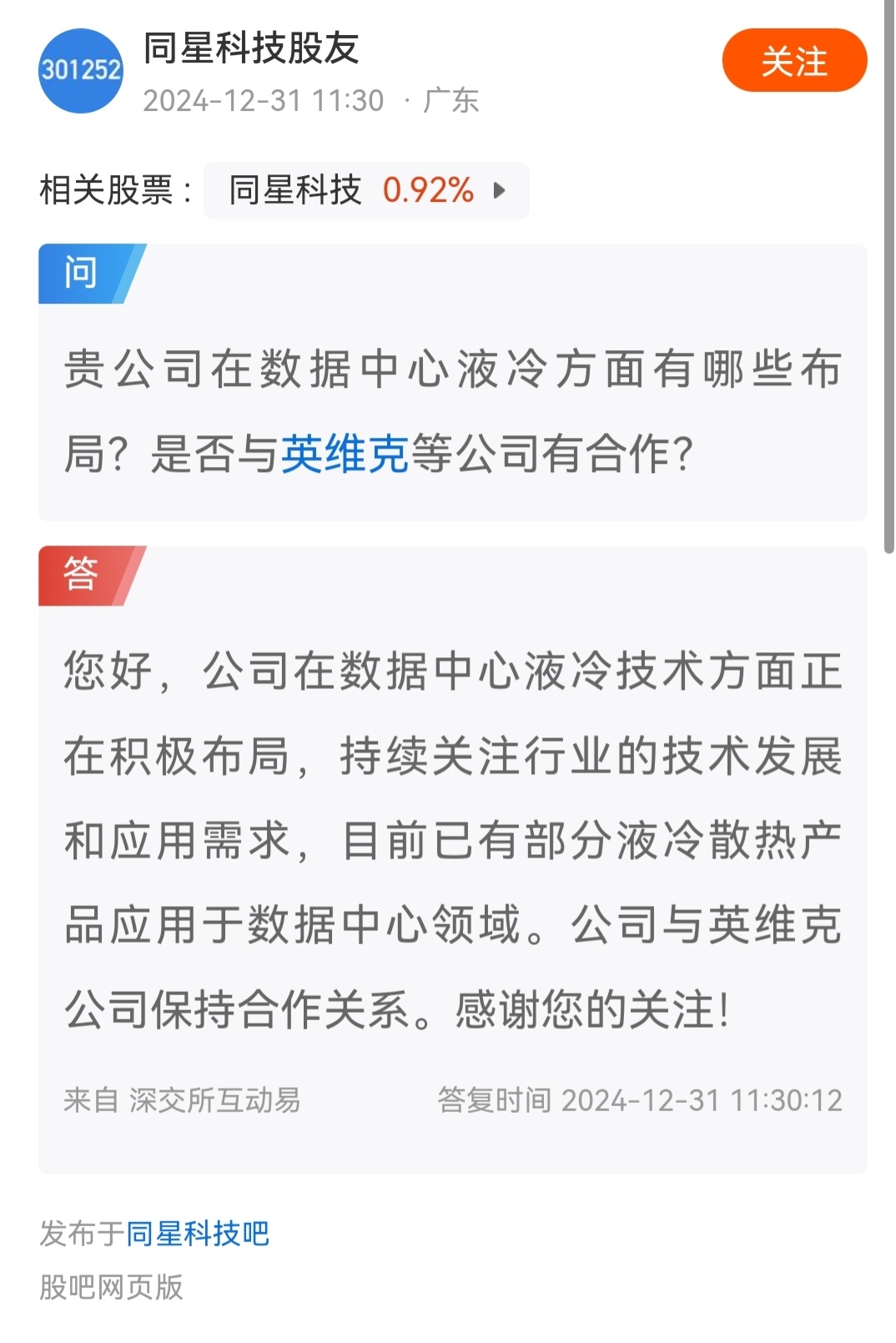 可惜是去年的回答,前几天$英维克(SZ002837)$ 英维克大涨,$同星科技(SZ301252)$ 作为上游供应商,也没人问一下董秘,不然消息刺激一下,可能补涨2个20厘米才对