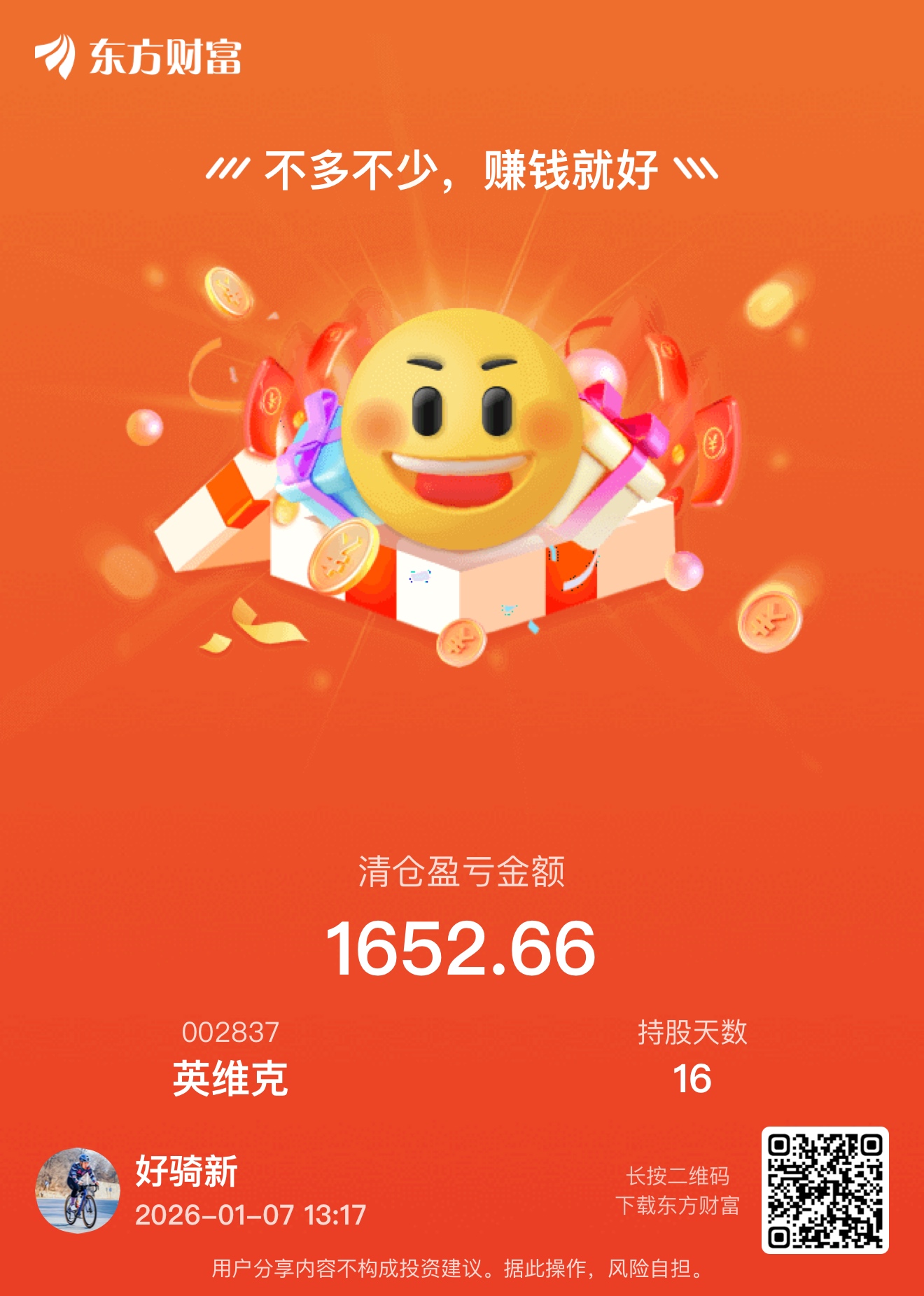 $英维克(SZ002837)$ 兄弟们遵循交易纪律,今天果然给了反弹就要跑,没给阳包阴证明弱了,今天是符合卖点的,至于明天如何是明天的交易了,从最多8000多的利润回撤到1600,下次一定不能格局,落袋为安永远是对的