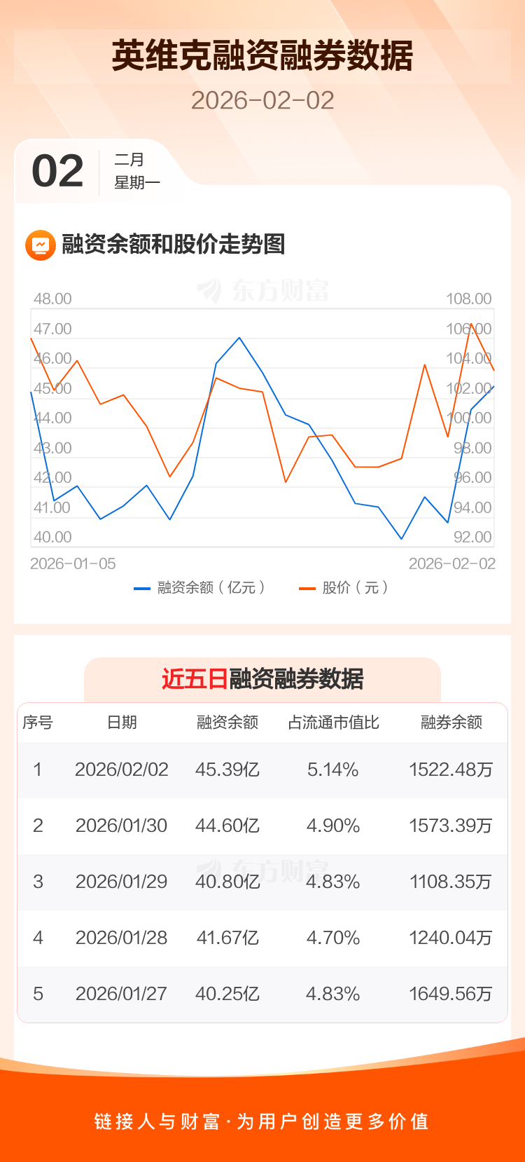 交易所最新数据显示,英维克于2026年2月2日获融资买入5.68亿元,融资偿还4.89亿元,当日融资净买入7897.79万元。目前,该股融资余额45.39亿,占流通市值比例为5.14%。