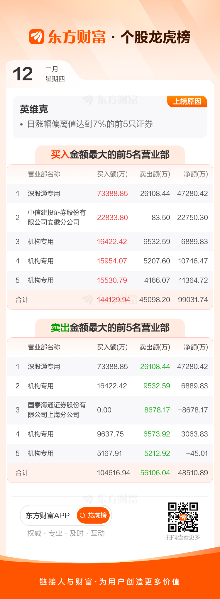 交易所2026年2月12日公布的交易公开信息显示,英维克因成为日涨幅偏离值达到7%的前5只证券上榜。英维克当日收报109.45元,涨跌幅10.00%,偏离值9.49%,换手率9.47%,成交额87.32亿。