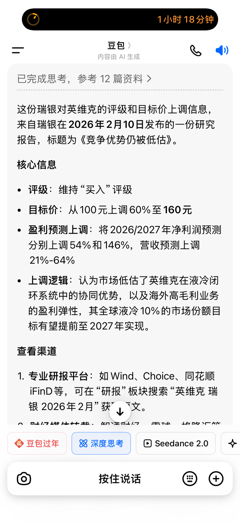 瑞银上调英维克价格到160元