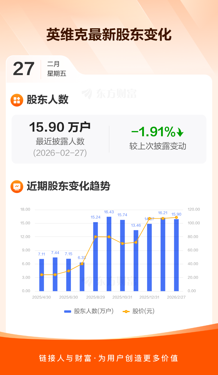 英维克最新披露数据显示,截至2月27日公司股东户数为15.90万户,较上期(2026年1月30日)减少3100户,降幅为1.91%。户均持有流通股数量由上期的5244股上升至5347股,户均持股金额由上期的56.11万元增加至58.02万元。