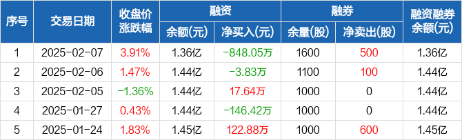 道恩股份:融资净偿还848.05万元,融资余额1.36亿元(02-07)