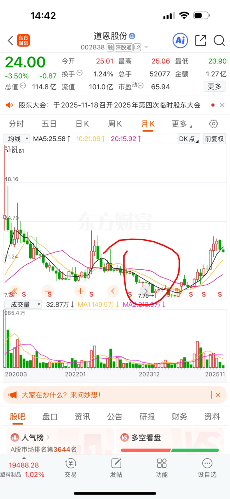 $道恩股份(SZ002838)$ 这种缩量出货慢慢出最恶心,前几年从26慢慢出到8块。每个月成交才20%换手。