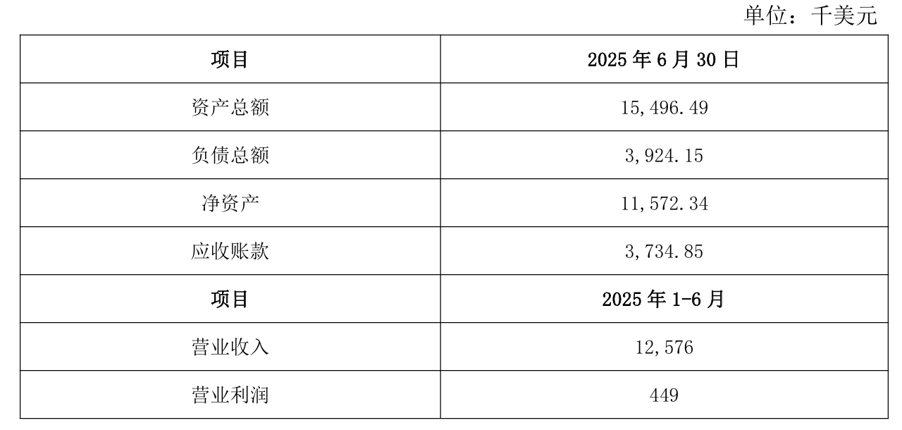 公告显示,目标公司是一家拟注册公司,拟分立后的目标公司截至2025年上半年末的净资产约1157.23万美元,应收账款约373.49万美元。2025年上半年营业利润约44.9万美元。