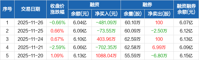 张家港行:融资净偿还481.09万元,融资余额6.04亿元(11-26)