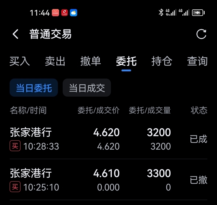继续加仓。挂4.61元本来可以加3300股,不成交。赶紧撤单挂4.62元,少加了