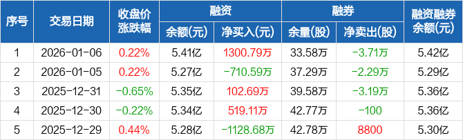 张家港行:融资净买入1300.79万元,融资余额5.41亿元(01-06)