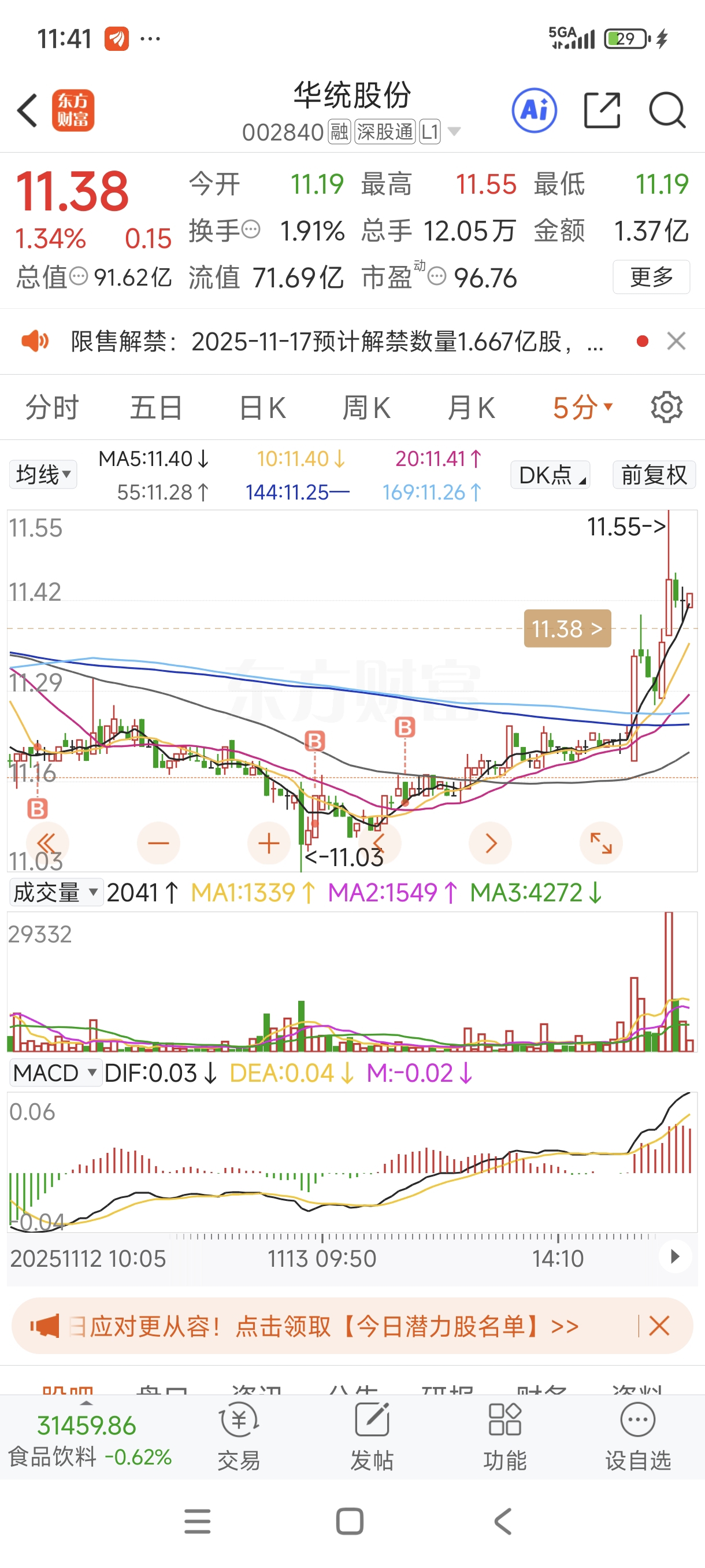$华统股份(SZ002840)$ 好股。买了,底部放量你们怕啥?底部解禁是利好。
